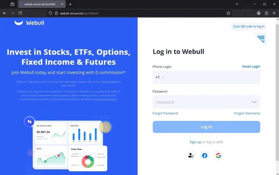 The redirect led to a fraudulent Webull login page hosted on a [.]ink domain. Beyond the surface-level imitation of the Webull platform, the attackers employed the same technical tricks as in the Schwab campaign: JavaScript obfuscation, mirrored file paths, and reused CSS assets. The overlap in tactics and infrastructure strongly suggests that both operations were carried out by the same group, leveraging a shared codebase to scale their credential-harvesting schemes across multiple financial brands.