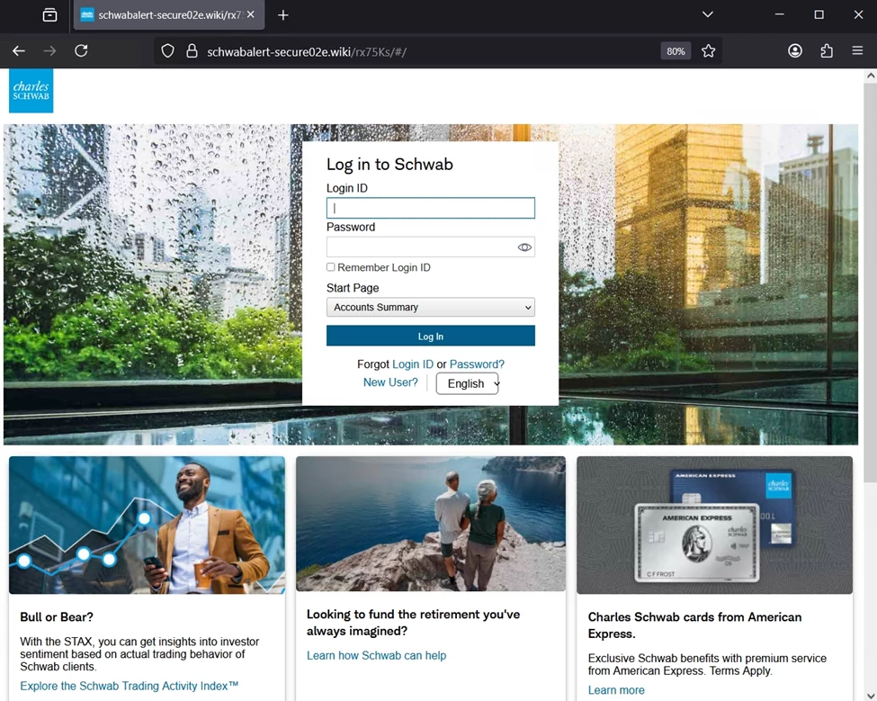 Those who clicked were sent to a fraudulent site designed to mimic the legitimate Charles Schwab login portal, this time hosted on a [.]wiki domain. The cloned page replicated Schwab’s branding and login layout with striking accuracy, leaving little visual indication that users were entering their credentials into a malicious site. This combination of brand impersonation, domain manipulation, and urgency cues makes the campaign particularly dangerous for unsuspecting recipients.