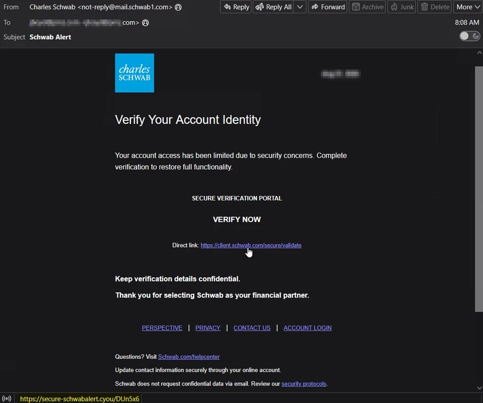 Brokerage and financial firms continue to be prime targets for cybercriminals, as compromised access to investment accounts can quickly translate into financial gain. Over the past several weeks, we have observed a rise in phishing campaigns spoofing Charles Schwab, with messages crafted to create a sense of urgency. In one case, recipients were told that their accounts had been restricted due to security concerns and were urged to verify their identity immediately. While the email displayed a convincing Schwab logo and familiar branding, the embedded link redirected users to a domain registered under the [.]cyou gTLD — a space frequently exploited by threat actors due to its low cost and weak oversight.