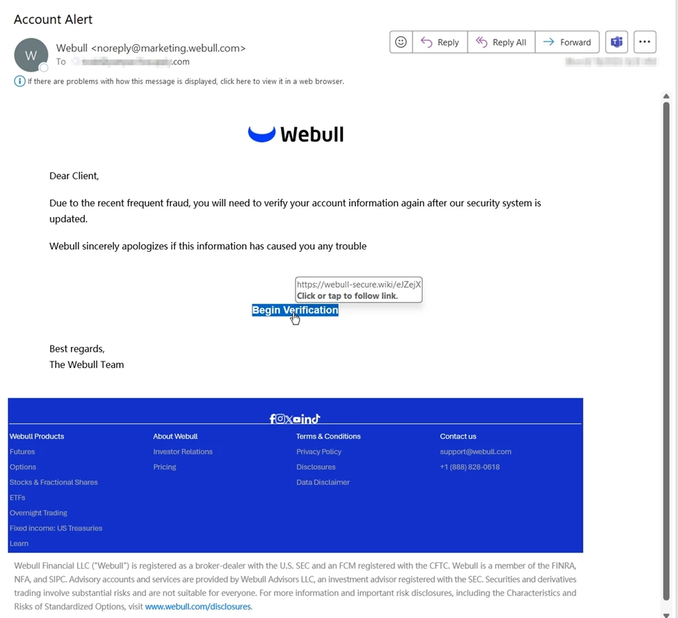 Another campaign, likely connected to the same operators, set its sights on Webull customers. These phishing emails followed a similar pattern, using sender addresses and lures that appeared legitimate, but linking to domains crafted with a company-secure[.]gTLD naming convention. Just as with the Schwab campaign, the attackers deliberately shifted between gTLDs to evade basic filtering. In this case, the email’s malicious link pointed to a [.]wiki domain, where victims were prompted to re-verify their account information.