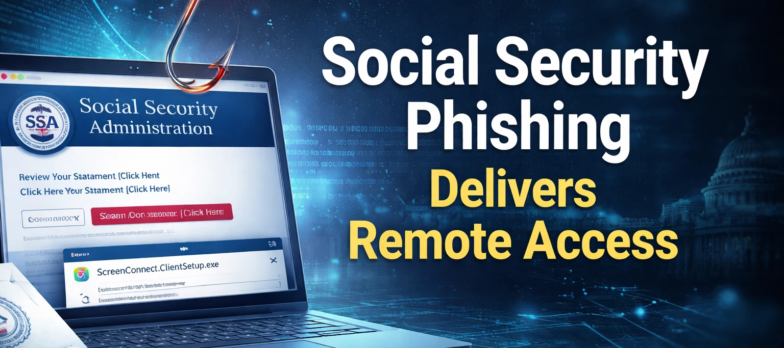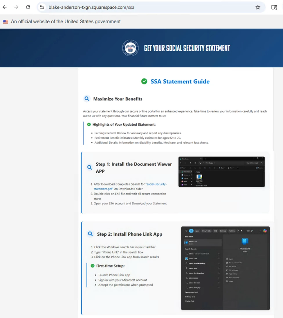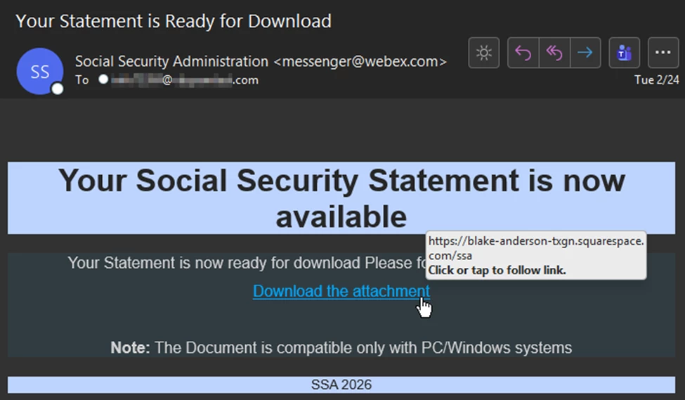 A recent malware campaign impersonated the U.S. Social Security Administration (SSA) to trick victims into installing remote access software. The phishing email directed recipients to review an urgent SSA statement via a link hosted on Squarespace infrastructure. The link redirected users to a fraudulent website designed to mimic official Social Security communications.