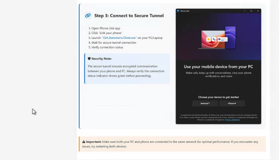 The phishing page also encouraged victims to install a phone linking application and connect their mobile device under the pretense of creating a “secure tunnel connection.” This step appears designed to extend attacker visibility across both desktop and mobile environments. If successful, it could allow attackers to intercept SMS messages, capture multi factor authentication prompts, or monitor communications originating from the victim’s mobile device. Expanding the compromise to mobile devices increases the attacker’s ability to bypass common authentication protections.