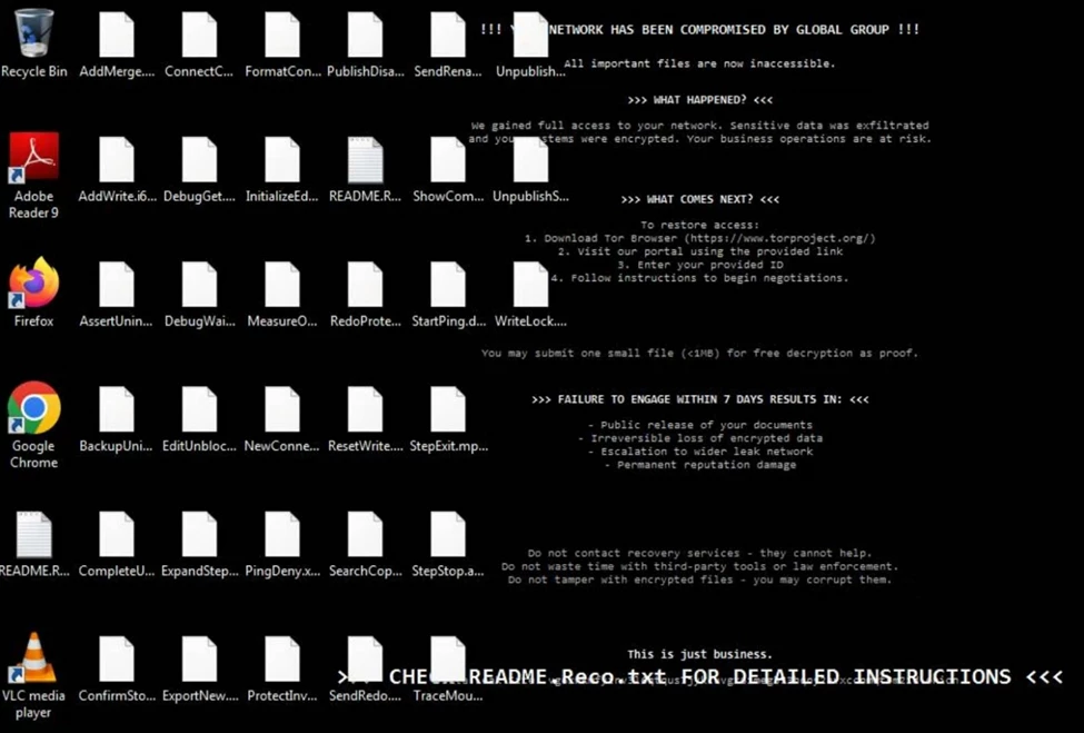 Once executed, encryption begins within minutes and rapidly impacts accessible files across the system. Screenshots show encrypted files spanning both user data and application-related directories, suggesting minimal directory exclusion beyond what is required to keep the operating system functional. Following encryption, the desktop wallpaper is replaced with a compromise notification asserting both data encryption and theft. This messaging reinforces a double extortion narrative despite no immediate on-screen proof of exfiltration.