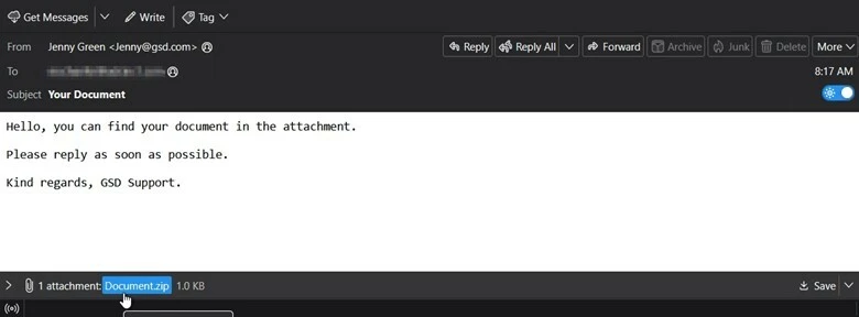 The ransomware affiliate tied to this activity appears linked to the LockBit ecosystem and is now operating under the rebranded name Global Group. Emails in this campaign contain a small ZIP attachment designed to resemble a routine document delivery. The attachment naming is intentionally bland, such as “Document.zip,” and the sender identity impersonates a generic support contact to blend into normal business correspondence. Rather than a legitimate file, the archive contains a Windows shortcut that executes an embedded PowerShell command, which retrieves and launches a secondary payload from remote infrastructure with little visible user interaction.