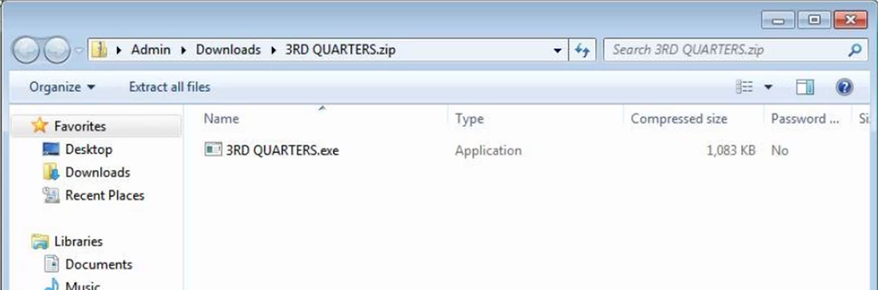 The screenshots show that the ZIP archive’s internal structure and file naming mirrored the campaign theme (for example, “3RD QUARTERS[.]exe”), a subtle touch that likely improved the campaign’s success rate.