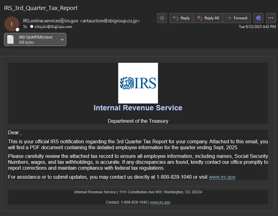 This particular iteration used an attached [.]html file that spoofed irs[.]gov branding, complete with legitimate-looking navigation links pointing back to the real site. Such blending of authentic and malicious assets continues to be a highly effective social-engineering technique.