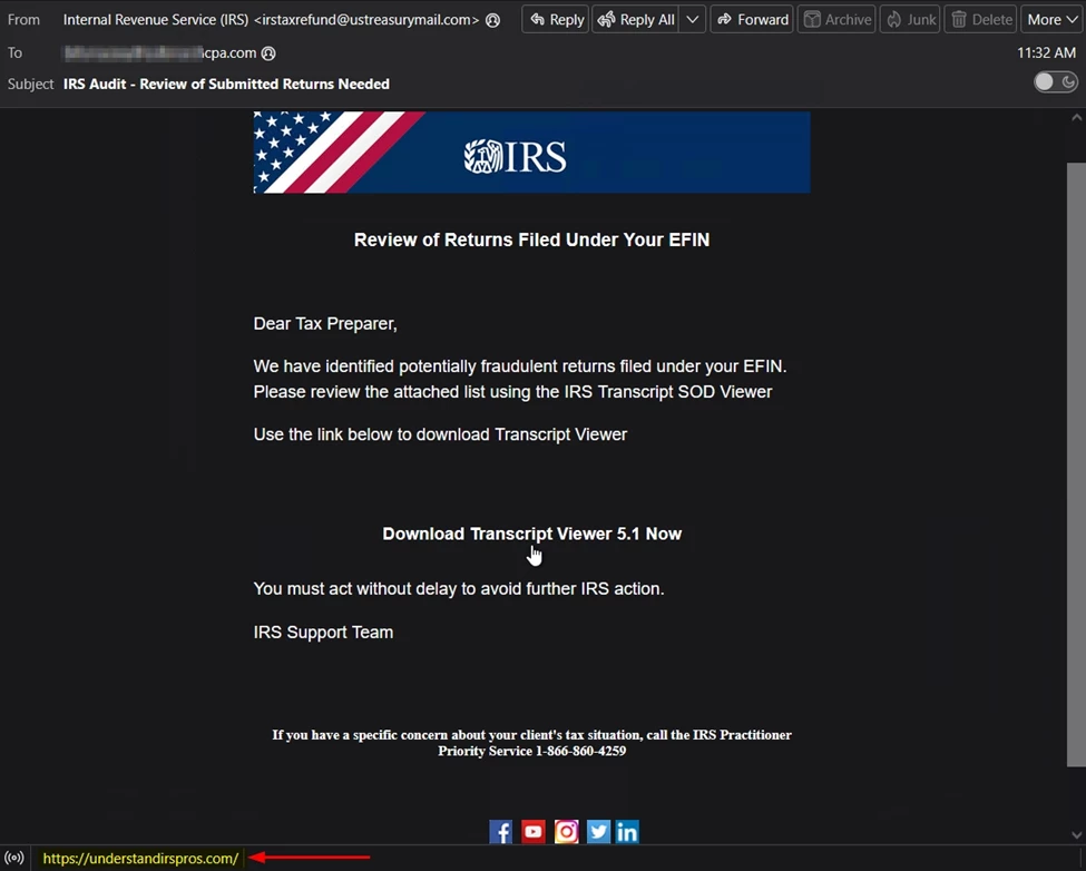 Malicious email attacks are actively masquerading as the U.S. Internal Revenue Service. One specifically targeted tax-preparation providers such as CPAs and law firms—groups that routinely handle sensitive taxpayer data. The lure warned recipients that potentially fraudulent returns were filed under their EFIN, the unique number assigned to authorized e-file providers and urged them to download a “transcript reviewer” to verify the returns. However, the link redirected to a non-government site registered only days before the campaign launched, a common hallmark of short-lived phishing infrastructure.