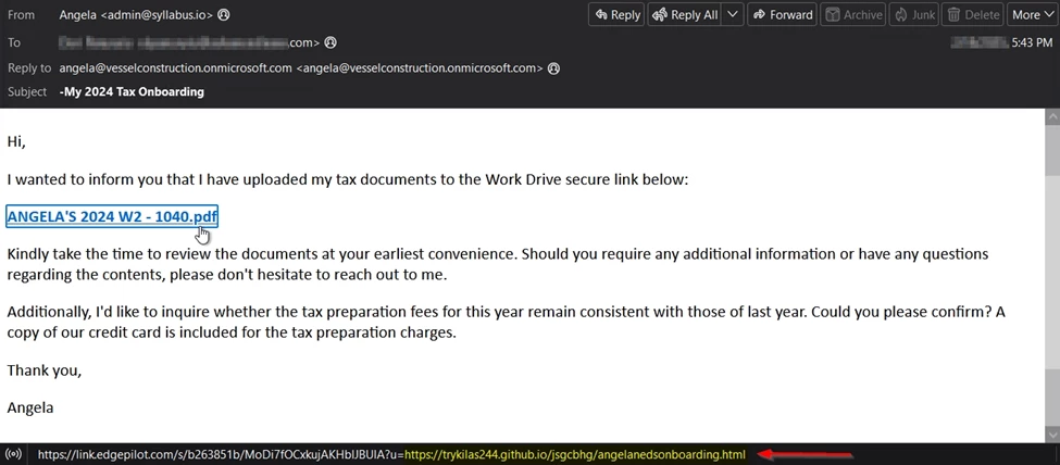Tax related attacks also commonly lead to malware infection. Remote access trojans, such as Remcos in the example below, are the preferred malware avenue for threat actors targeting attorneys and accountants. This example claimed to be tax documents uploaded to a secure work drive. We often see these threat actors engage in pre-texting to add a sense of legitimacy to the message. In this case, inquiring if preparation fees remained consistent with the previous year. The link within purported to be the sender’s W2 (wage statement) but it pointed to a GitHub page.