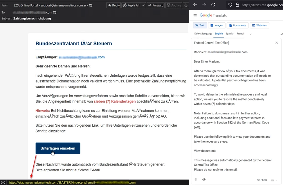 One German example stated the recipient had outstanding documents that needed to be resolved within seven days. While the message originated from the United States, the from address (which can easily be spoofed) indicated an Argentinian sender while the URL pointed to a staging[.]unitedsmarttech[.]com, a domain unrelated to German tax authorities.