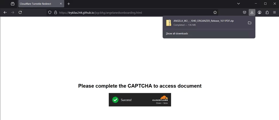 If the user clicked the link, they would first encounter Cloudflare’s human check. If successfully completed, a zip file download commences which contains an executable to initiate the Remcos infection chain.
