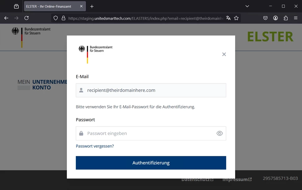 If clicked, the destination reveals a cloned version of the German Federal Central Tax Office soliciting credentials to post back to the threat actor.