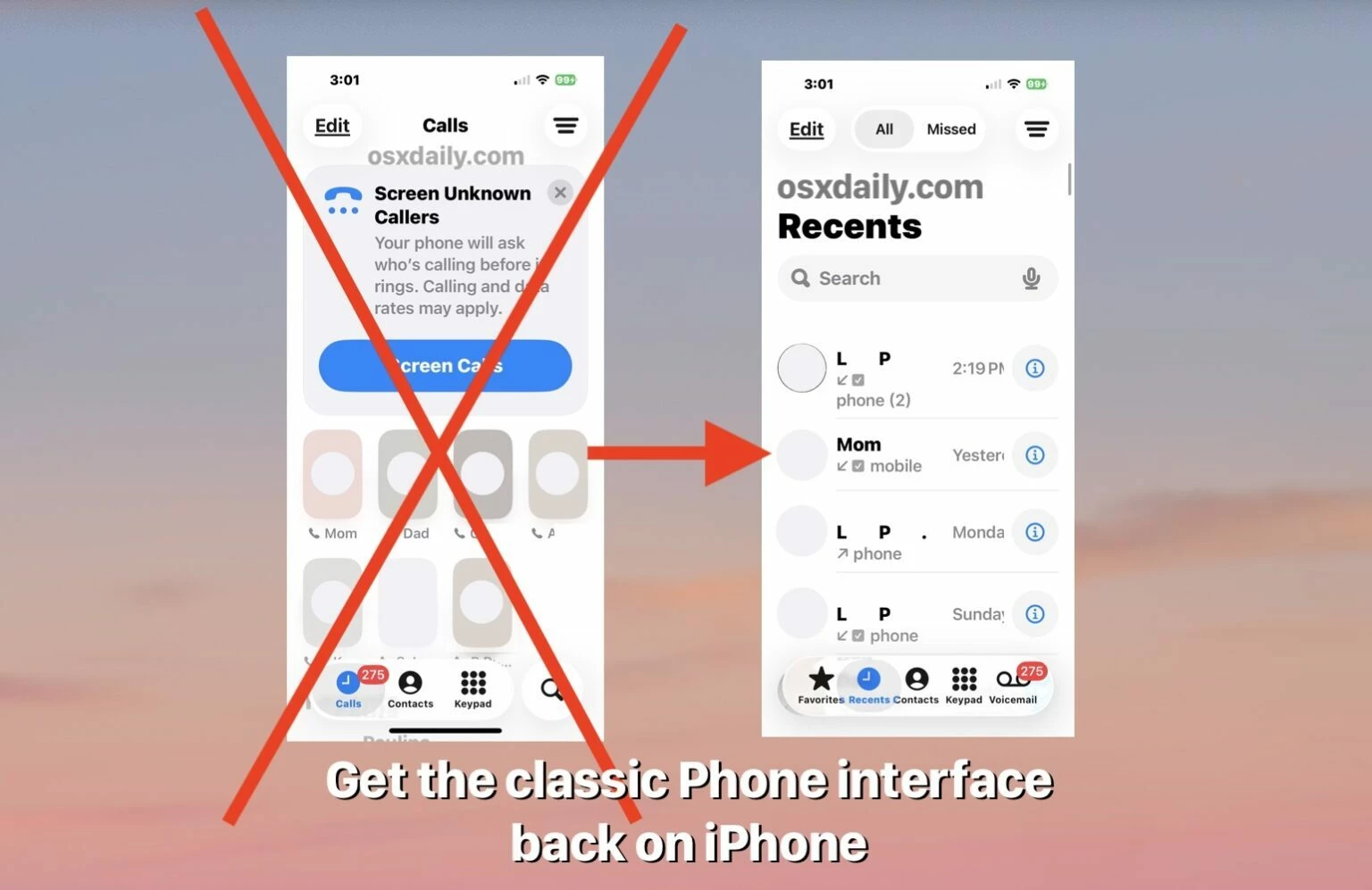 If you’re unhappy with the new Phone app design in iOS 26, you can restore the old classic Phone layout onto iPhone with iOS 26 again. With the classic layout returned, you will no longer have the cluttered unified Phone interface, and you’ll instead have easy access to your familiar tabs for Favorites, Recents, Contacts, Keypad, and Voicemail again.