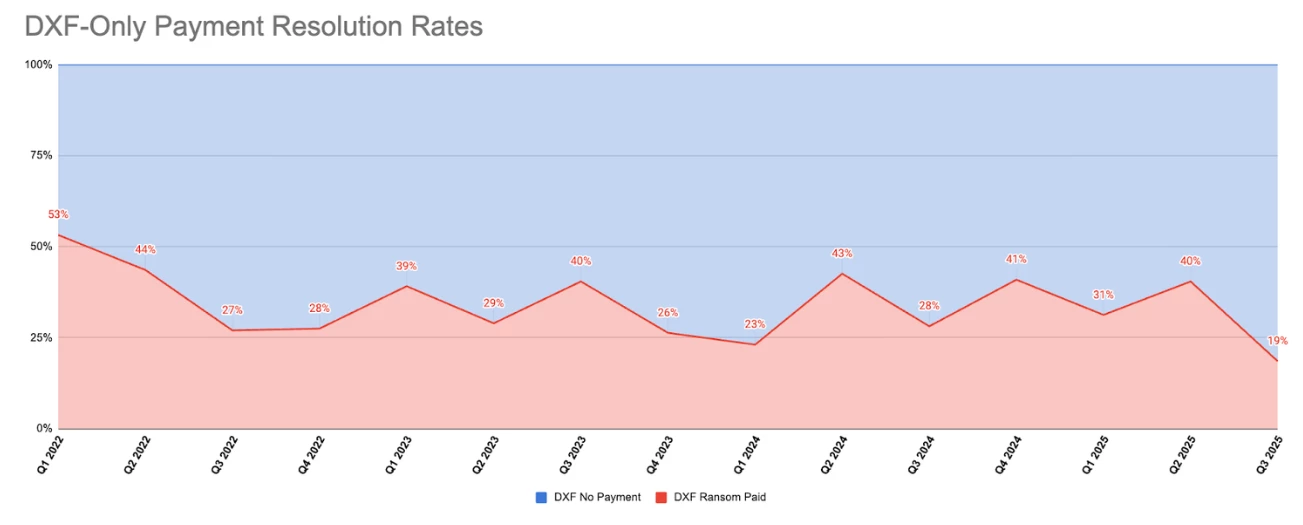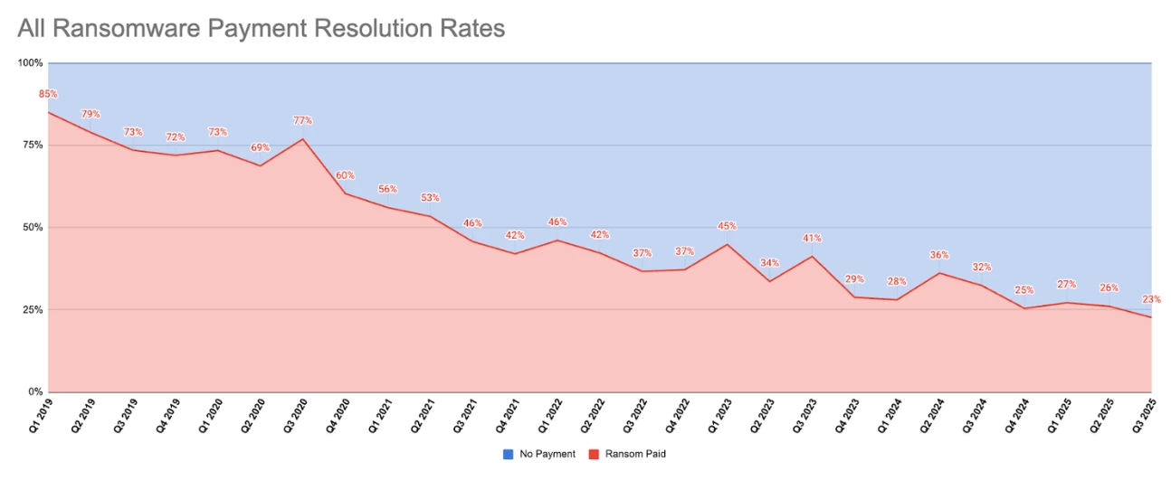Even as ransom demands fluctuate, fewer victims are choosing to pay. Over the past several years, the rate of payment has steadily declined as more organizations invest in recovery and refuse to reward extortion.