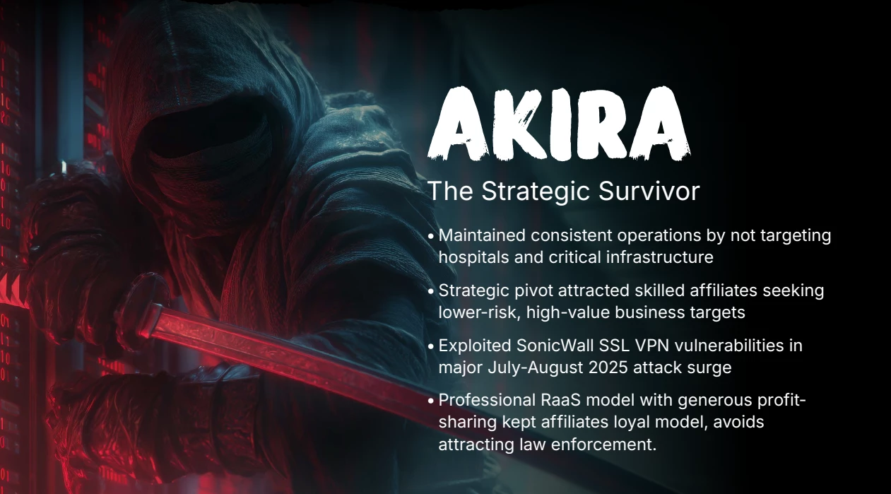 The pivot worked. Akira claimed nearly one in five global ransomware incidents this year, becoming the most consistent and financially successful operation of 2025. Their refined playbook and reputation for stability attracted skilled affiliates looking for predictable payouts.