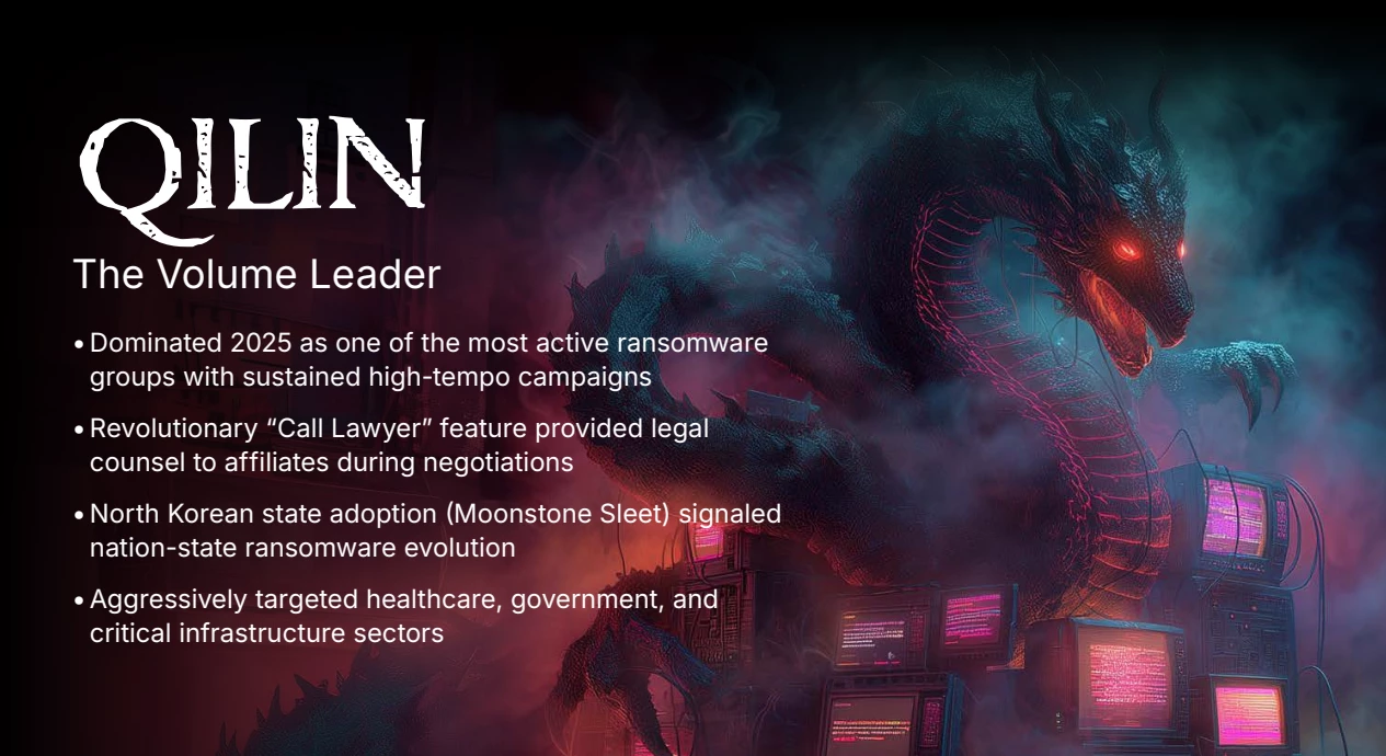 Qilin takes the top spot for 2025 after a relentless year of attacks that pushed hospitals, laboratories, and local governments to the brink. The group executed more than 200 confirmed incidents, averaging one new healthcare breach every week. Their methods are ruthless and efficient, showing no hesitation to disrupt life-critical systems if it increases leverage.