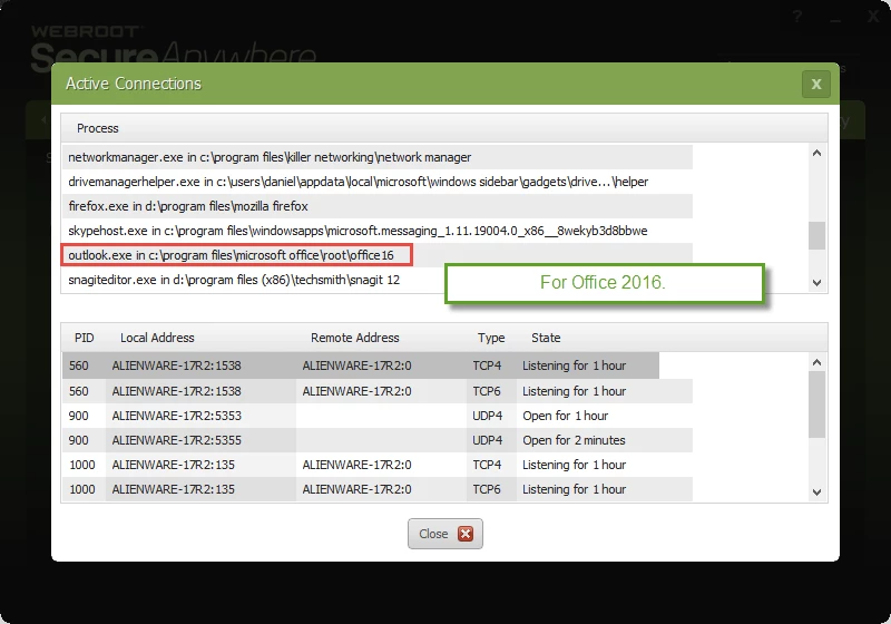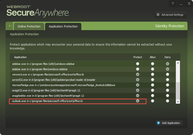 You can add it back but put it under protect: http://www.webroot.com/En_US/SecureAnywhere/PC/WSA_PC_Help.htm#C6_IDProtection/CH6c_ManagingProtectedApps.htm you will have look for outlook.exe to add it back to ID Shield. Now you have Windows 7 and you have access to WSA's Firewall so look in there to make sure it's set to Allow if it's under Block: http://www.webroot.com/En_US/SecureAnywhere/PC/WSA_PC_Help.htm#C4_Firewall/CH4c_ManagingActiveConnections.htm I'm sure that's it as in Windows 8 and 10 WSA does not show the same settings in Windows 7 see here: https://community.webroot.com/t5/Ideas-Exchange/Outbound-connections-fw-control-in-Win-8-Win-8-1/idi-p/60003 and notice what JoeJ said here.@ wrote: