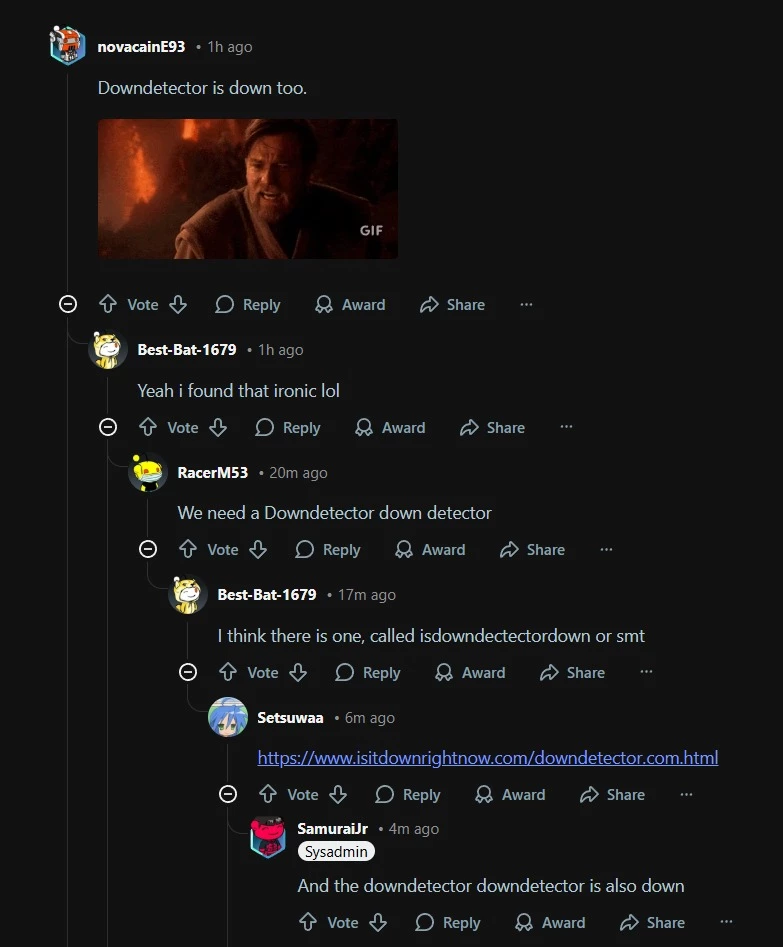 Users went to sites like “is Cloudflare down” and saw errors. Then they went to “is Downdetector down” websites and found those pages down too. It created a loop where even the tools designed to tell you something is down were also down.