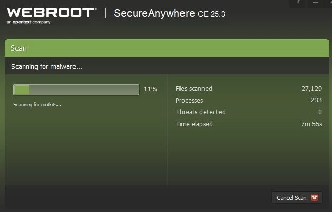 I just scanned my computer, and noticed webfoot is Frozen at 11%. I tried scanning again, same issue. I did scan with my Malwarebyes, there was no issue. Here is the screen-shot