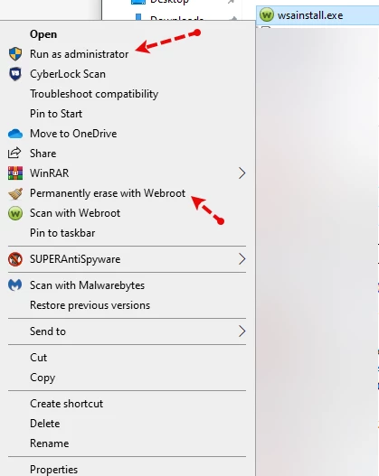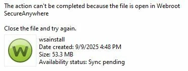After installing the latest version of Webroot in my Windows 10 machine, there are bits and pieces of the download remaining in my Download File and normally I delete these for other programs I’ve downloaded. But in the case of Webroot, a remaining installation file won’t delete from the download. Any suggestions?